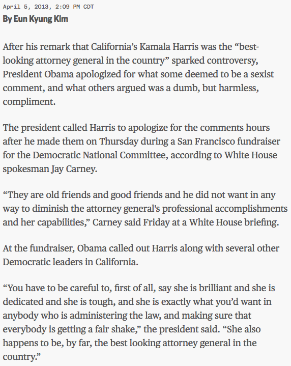In remarks today, President Obama described California Attorney General Kamala Harris “as by far, the best looking attorney general.” Now, he had also described her as “brilliant,” “dedicated,” and “tough,” but … no.