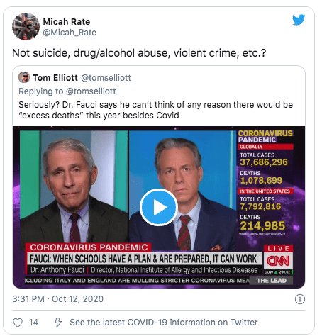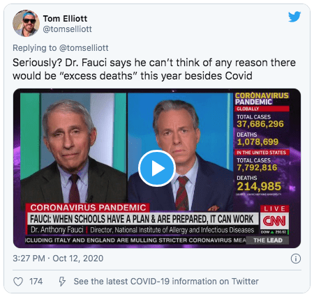 Seriously? Dr. Fauci says he can’t think of any reason there would be “excess deaths” this year besides Covid pic.twitter.com/VsEjSvIptK— Tom Elliott (@tomselliott) October 12, 2020