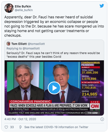 Apparently, dear Dr. Fauci has never heard of suicidal depression triggered by an economic collapse or people not going to the Dr. because he has scare mongered us into staying home and not getting cancer treatments or checkups. https://t.co/dd6ohJfkAh— Ellie Bufkin (@ellie_bufkin) October 12, 2020