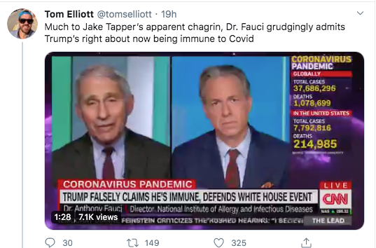 Much to Jake Tapper’s apparent chagrin, Dr. Fauci grudgingly admits Trump’s right about now being immune to Covid pic.twitter.com/wJKmALXl5W— Tom Elliott (@tomselliott) October 12, 2020