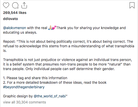 Pop star Demi Lovato shared a lengthy lecture on Instagram Wednesday calling gender reveal parties “transphobic.” Her post attacked the idea of celebrating baby boys and girls as a tradition that “naturalizes cultural myths as ‘biological facts.’”