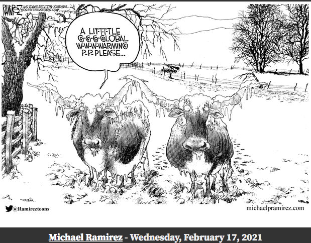 In February of 2021 we had record cold and record snow. Pipes froze clear down in Houston. Texas windmills froze and we had rolling power blackouts all thru the high plains. It has to be O’Biden’s fault.Joseph O’Biden is all for males (many of whom have NOT even begun transitioning nor taking female hormones) unfairly competing with females in sports