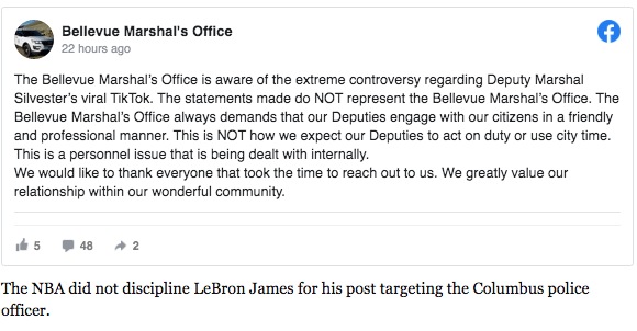 In response, Bellevue Marshal’s Office Deputy Nate Silvester posted a video pretending to have a conversation with James while responding to a hypothetical fight between two black people.