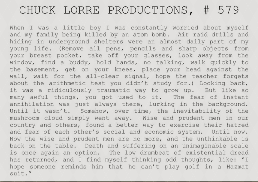 Chuck Lorre, the creator of a number of hit comedies on CBS, was apparently traumatized by those old duck-n-cover drills. His vanity card #579 says this: