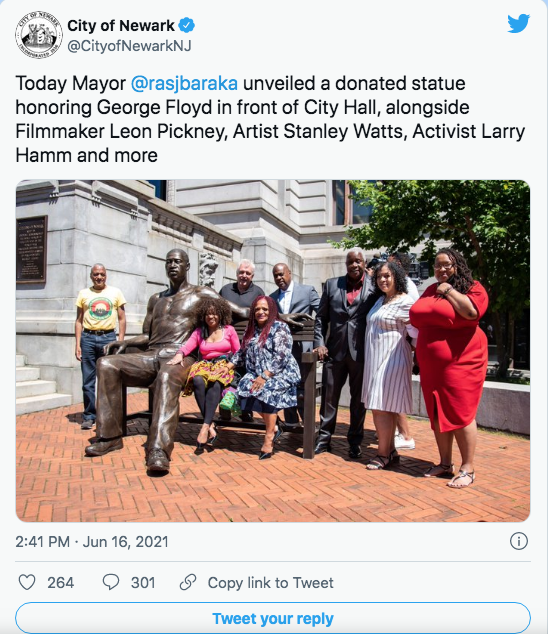 A New Jersey city offered a tribute to George Floyd Wednesday by unveiling a 700-pound bronze statue of him outside Newark’s City Hall.