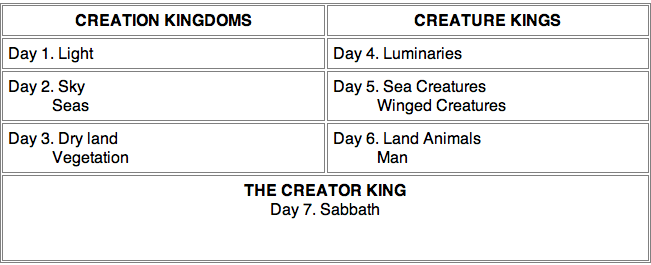 I want to add to the chart above the concept of complementary duality. Each kingdom had a complementary duo. The first kingdom had day and night. The second kingdom had sky and sea. The third kingdom had dry land and vegetation to cover the land. Day four had two luminaries the sun and the moon. The fifth day had sea creatures and winged creatures. The sixth day had land animals and man. And most importantly the image of God has two genders – male and female – that complement each other and together make “man”.