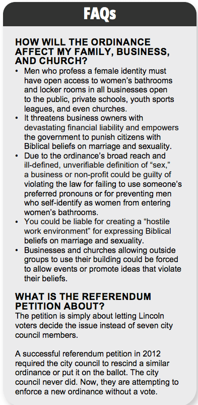 Let Us Vote is a petition drive launched by Nebraska Family Alliance requiring the Lincoln City Council to rescind a gender identity bathroom ordinance or put it on the ballot for a vote of the people.