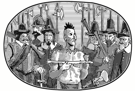 The Englishmen who explored Massachusetts Bay did nothing to make themselves especially welcome. In the decade before the Pilgrims arrived, there had been various incidents in which natives, dozens in total, had been invited on board French, English, Dutch, or Spanish ships and kidnapped, either to be trained as guides or sold as slaves. One of these was Squanto, captured near Plymouth in 1614, who escaped from the Spanish slave port of Málaga to London and made his way back to his native Plymouth. The Pilgrims, naïve about this history, blundered into a war zone. They themselves stole buried corn in their first hungry days in the New World, and were greeted with a shower of arrows on their first encounter with Indians. They did plenty of fighting, led by a secular mercenary named Myles Standish—brave, erudite, underhanded, and so diminutive that he was known (though not to his face) as “Captain Shrimp.” But even decades later, as tension rose between nearby colonies and nearby Indians, the Pilgrim-Wampanoag peace held.