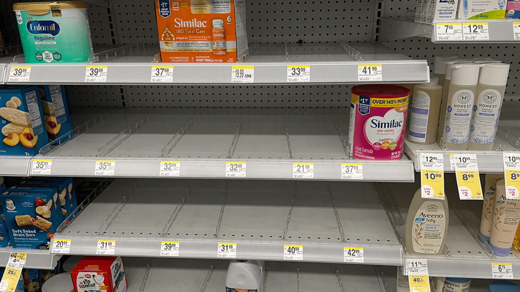 HERNANDEZ: We talked to a couple of moms outside who said that they’ve been having a really hard time finding formula and so this is what we’re seeing right now. The second Target that we’ve been to, we first went to Target in Lewisville and now we’re in Frisco, and as you guys can see, it’s pretty much the exact same thing here. Grocery stores pretty much empty, no formula to be found. I’ve talked to a couple moms who were telling me that people have spent upwards of $150 on formula on Amazon. Some moms can’t even find the formula that their baby requires. One mother telling me her child is constipated, needed a specific type of formula, couldn’t find it. So, that’s what’s going on.