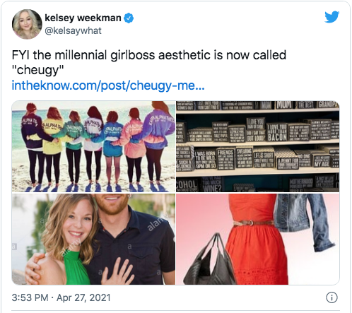 Another way to describe aesthetics/people/experiences that are basic. It was coined by a now 23 year old white woman in 2013 while a student at Beverly Hills High School, on whom the irony is apparently lost. According to the New York Times, “cheugy (pronounced chew-gee) can be used, broadly, to describe someone who is out of date or trying too hard.”