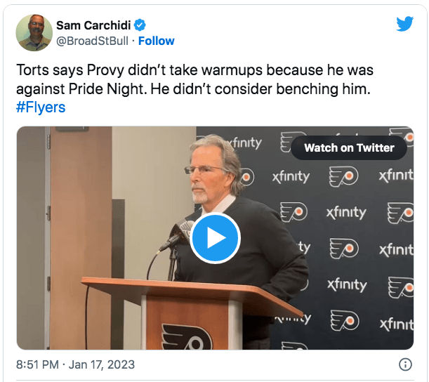 “The Philadelphia Flyers organization is committed to inclusivity and is proud to support the local LGBTQ+ community,” the statement said. “Many of our players are active in their support of local LGBTQ+ organizations, and we were proud to host our annual Pride Night again this year. The Flyers will continue to be strong advocates for inclusivity and the LGBTQ+ community,” the Flyers said.