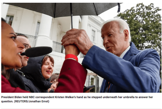 Biden approached Welker, grabbed her hand and pulled her umbrella towards him to keep dry.
