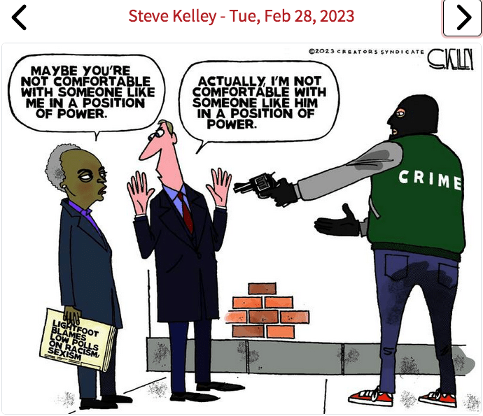 Lori Lightfoot (aka Beetlejuice) was the diversity hire supreme in Chicago’s storied history. As a democrat, black, female, lesbian, married to a woman, Leftist, incompetent dolt she represented everything your common college-educated (almost always in the humanities), guilty, white liberal snowflake needed in a politician. As always under her divine guidance the city went to hell. Soaring unemployment, welfare, crime, murders, gun violence and disintegration followed as in every big blue city.