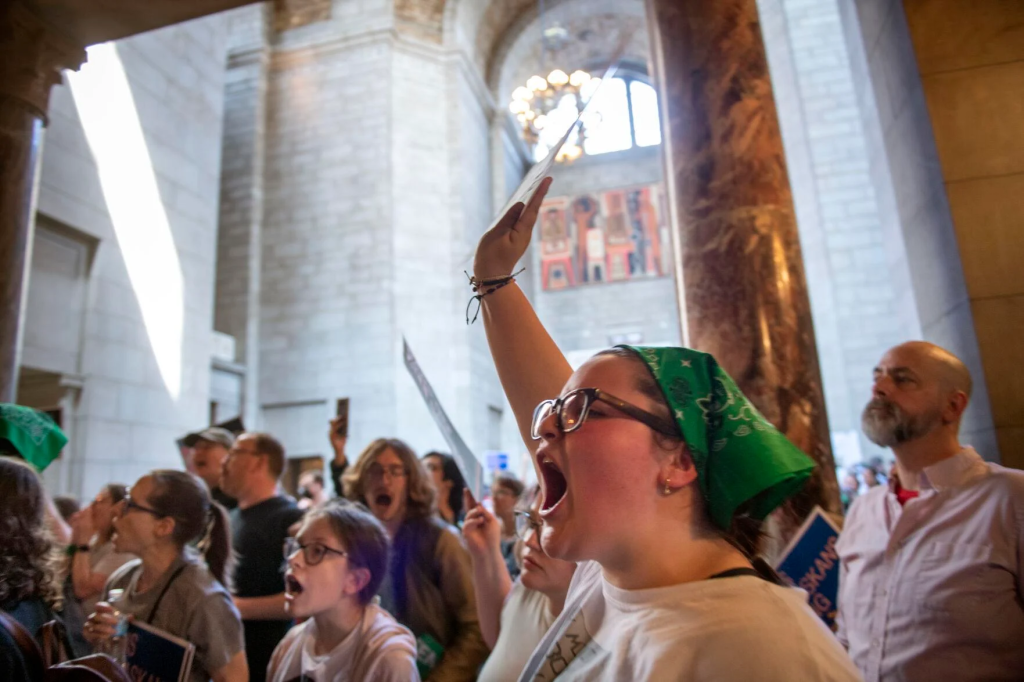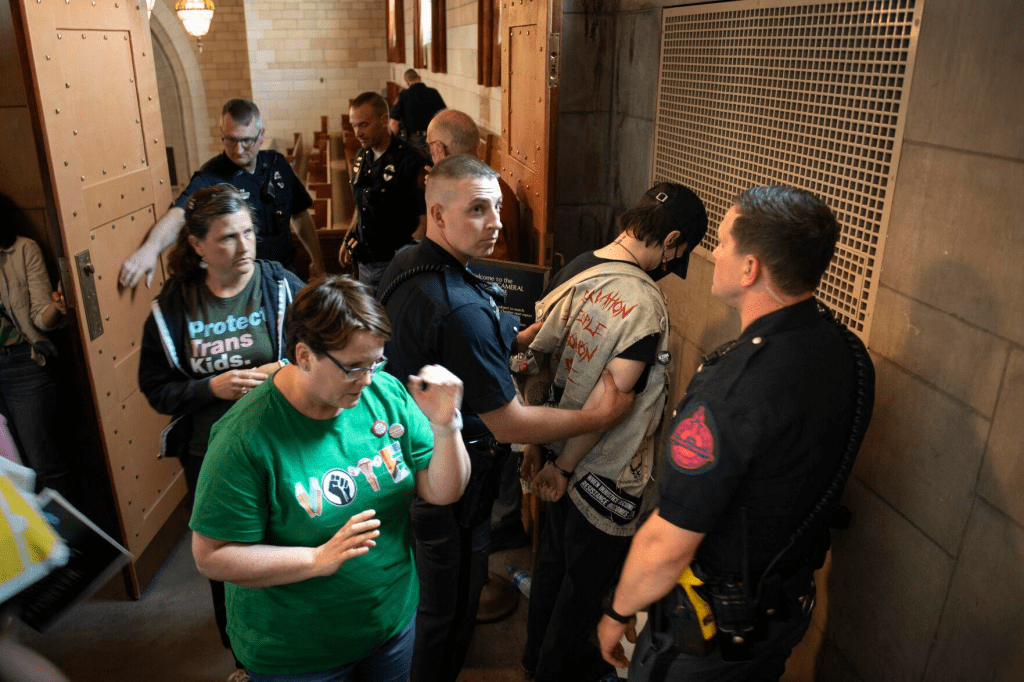 At least six people were arrested at the Nebraska state capital Friday after protests broke out over a bill passed that bans abortions after 12 weeks and restricts gender transition procedures for those under 19