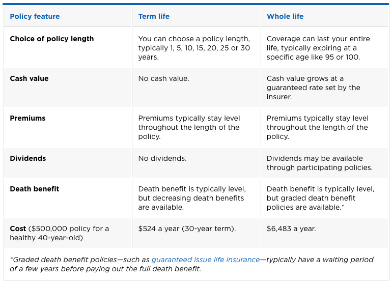 The difference between term and whole life insurance can be boiled down to cost and length. Term life insurance is cheaper than whole life and covers you for a set period of time. Whole life insurance typically lasts your entire life and can build cash value, which makes it a more complex and expensive product.