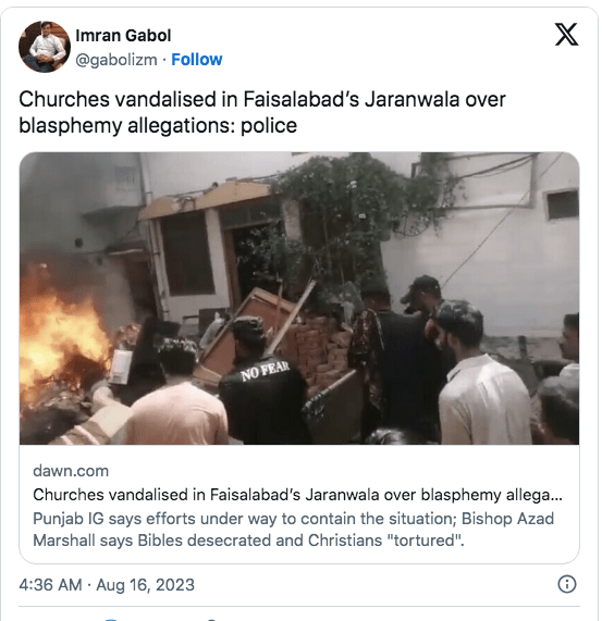 “Words fail me as I write this. We, Bishops, Priests and lay people are deeply pained and distressed at the Jaranwala incident in the Faisalabad District in Pakistan. A church building is being burnt as I type this message,” he wrote. “Bibles have been desecrated and Christians have been tortured and harrased [sic] having been falsely accused of violating the Holy Quran.”