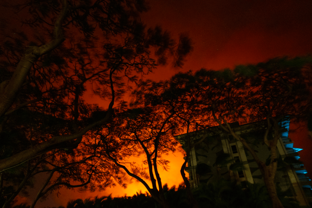 Wildfires burn over the town of Lahaina as seen in the neighboring Kaanapali Alii resort, on August 08, 2023, in Kaanapali, Maui, Hawaii (Gonzalo Marroquin/Getty Images)