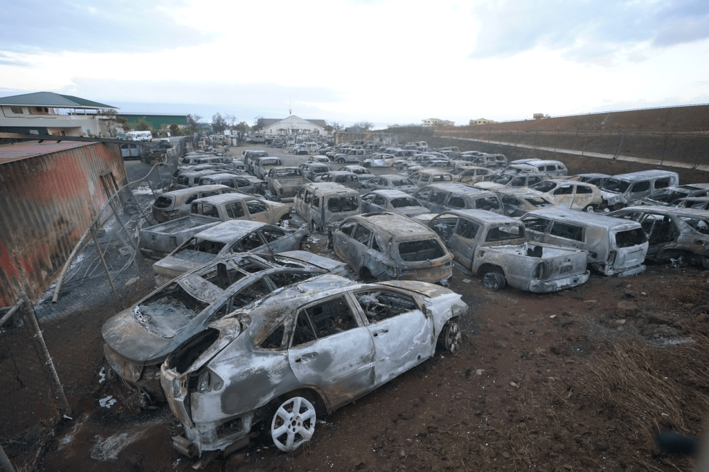 Wildfire wreckage is shown on Aug. 11, 2023, in Lahaina, Hawaii. (AP Photo/Rick Bowmer)