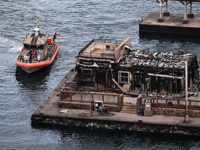 An aerial image shows a U.S. Coast Guard vessel docking in the harbor near a destroyed building in the historic Lahaina Town in the aftermath of wildfires in western Maui in Lahaina, Hawaii, on August 10, 2023. (PATRICK T. FALLON/AFP via Getty Images)
