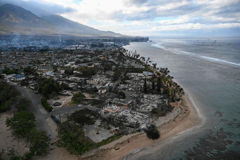 An aerial image taken on August 10, 2023 shows destroyed homes and buildings on the waterfront burned to the ground in Lahaina in the aftermath of wildfires in western Maui, Hawaii. (PATRICK T. FALLON/AFP via Getty Images)