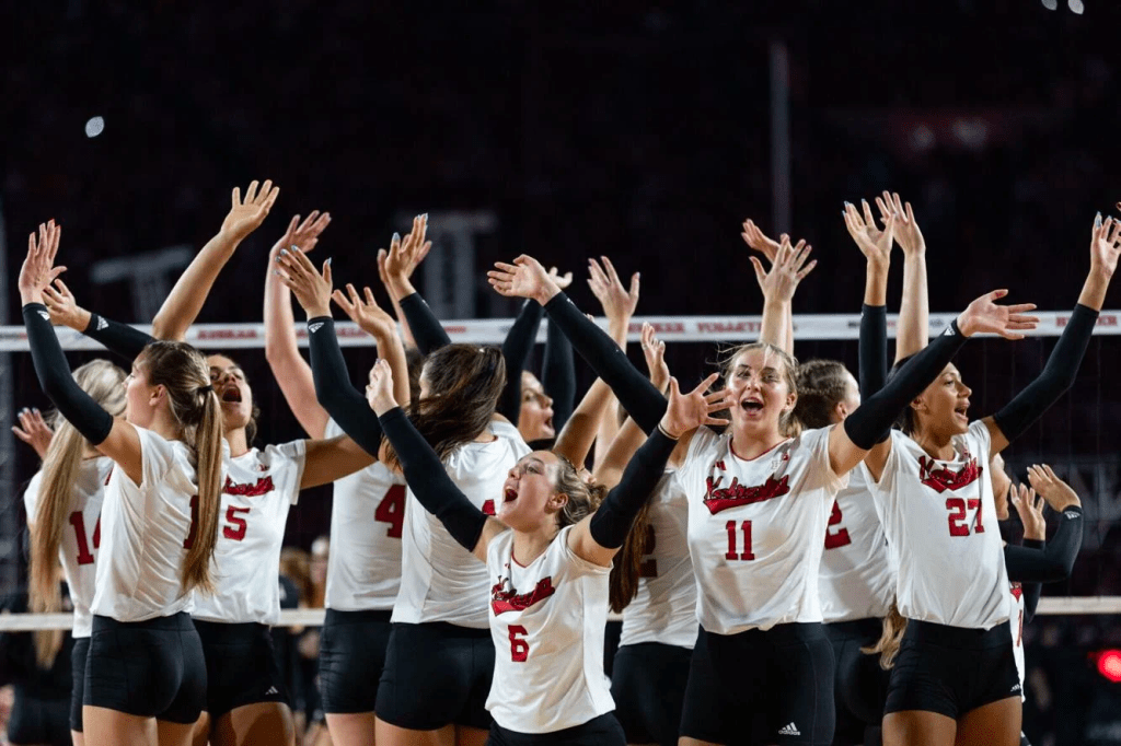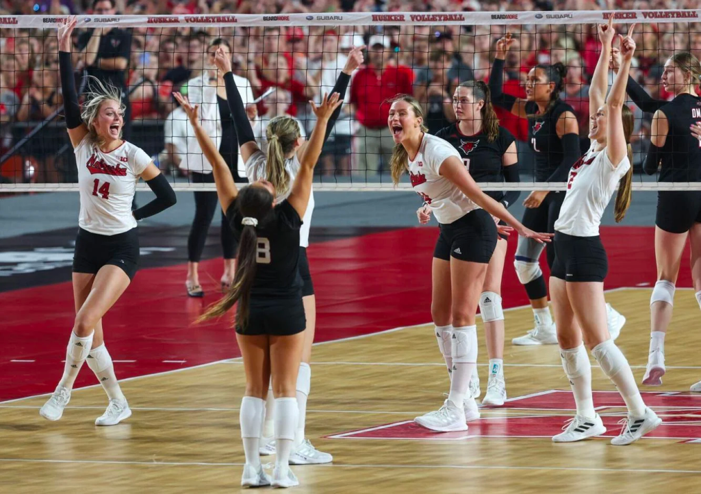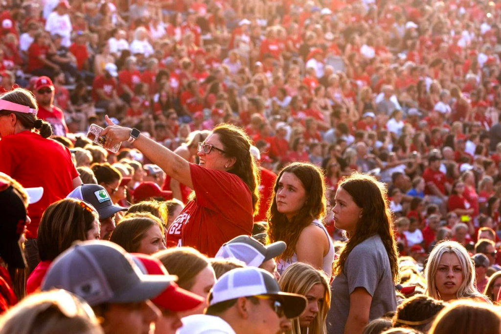 Joshua Warner celebrates as the world-record attendance for a women’s athletic event is announced during the third set of a Volleyball Day in Nebraska match at Memorial Stadium in Lincoln on Wednesday, Aug. 30, 2023.NIKOS FRAZIER THE WORLD-HERALD