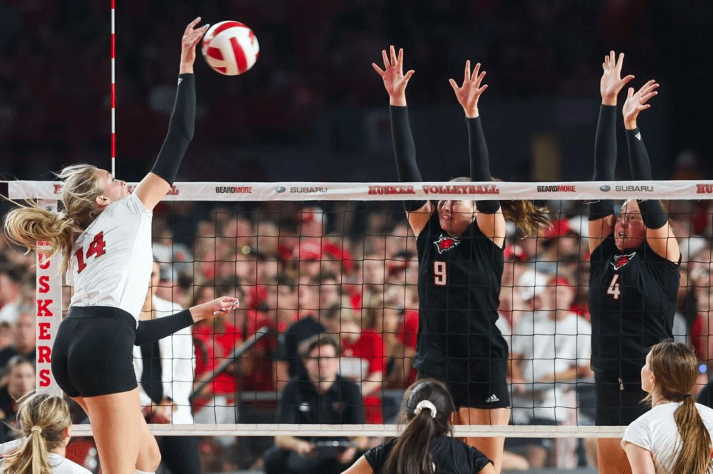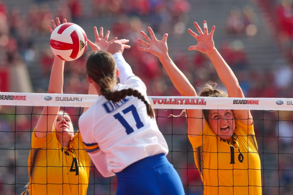 Wayne State’s Rachel Walker (14) and Wayne State’s Maggie Brahmer (18) go up to block against Kearney’s Asha Regier (17) during the first set of a Volleyball Day in Nebraska match at Memorial Stadium in Lincoln on Wednesday, Aug. 30, 2023.NIKOS FRAZIER THE WORLD-HERALD