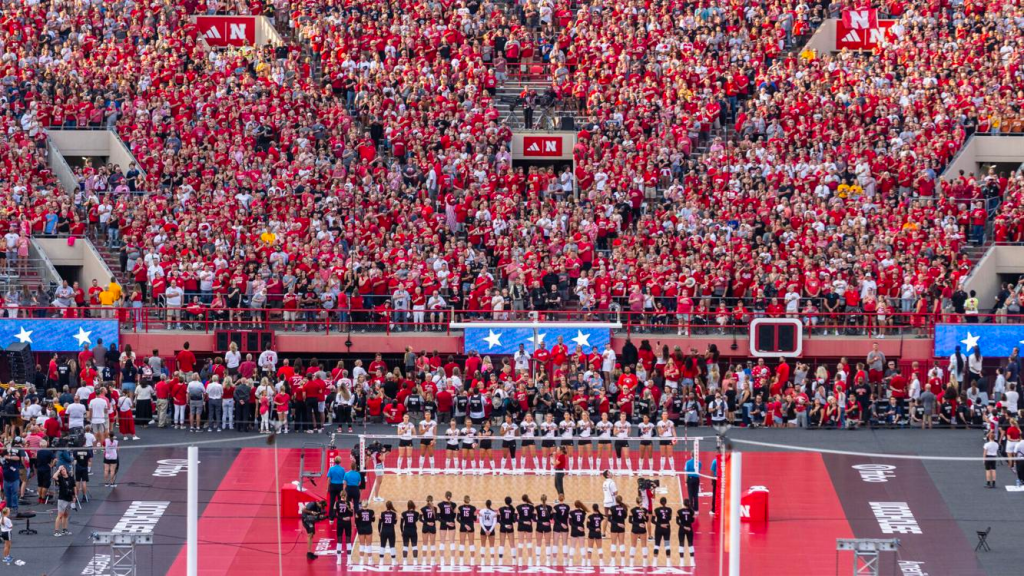 Nebraska, top, and Omaha’s teams stand during the national anthem during Volleyball Day at Memorial Stadium in Lincoln on Wednesday, Aug. 30, 2023.CHRIS MACHIAN THE WORLD-HERALD