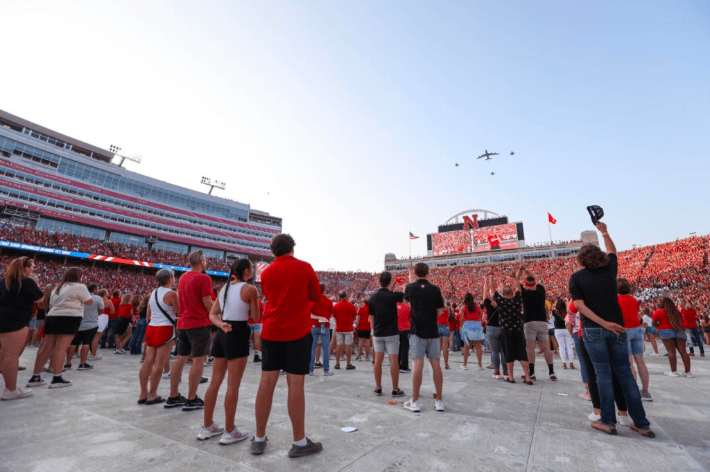 A KC-135 Stratotanker and trio of F-16 Falcons perform a flyover above Memorial Stadium during Volleyball Day in Nebraska in Lincoln on Wednesday, Aug. 30, 2023.NIKOS FRAZIER THE WORLD-HERALD