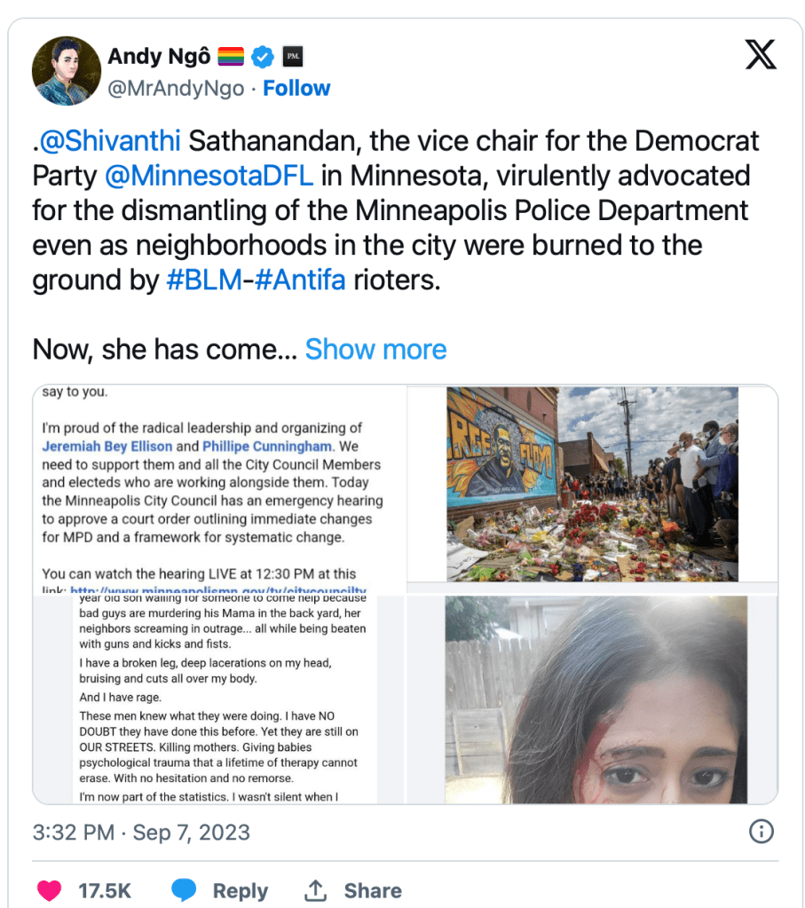 According to the Post, Sathanandan said in a social media post three years ago that she and fellow activists were “going to dismantle the Minneapolis Police Department” because it had failed citizens.