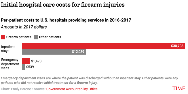 Another analysis from Everytown Research, a gun safety advocacy organization, puts medical costs even higher than the Harvard study, at $3.5 billion a year, though that figure accounts for survivors’ long-term care, coroner services for fatally shot victims (of which there are some 40,000 a year), and mental-health services for family members.