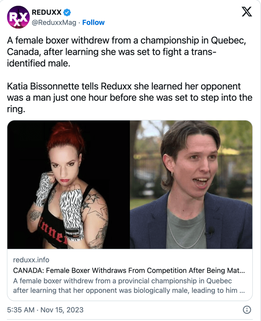 “I came down from my hotel room to head towards the room where all the boxers were warming up. My coach suddenly took me aside and told me he received information by text message, which he had then validated, that my opponent was not a woman by birth. We did not have any other additional information,” Bissonnette told Reduxx.