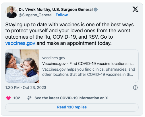 Surgeon General Vivek Murthy has barely acknowledged COVID vaccines in the past month, instead focusing on mental health, which research as recently as September has concluded was worsened by COVID policies. As with other federal officials, Murthy appears more likely to encourage vaccination in general than for COVID specifically.