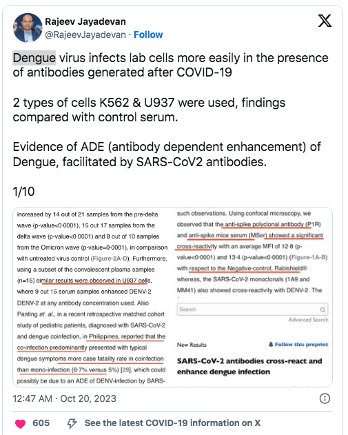 A new Indian preprint finds that COVID antibodies “enhance” a much worse disease, dengue, raising serious questions about the safety of boosting in dengue hotspots. Previous peer-reviewed research has already found “cross-reactivity” between the two viruses and their antibodies.
