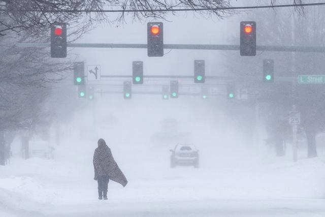 A man wearing a leopard print blanket braves bitter cold gusts of snow and wind as he walks down South 17th Street, on Friday.KENNETH FERRIERA, Journal Star