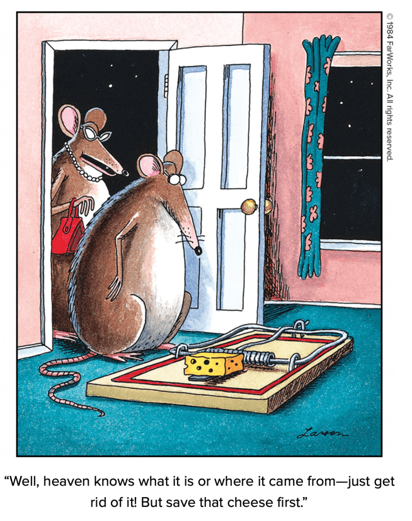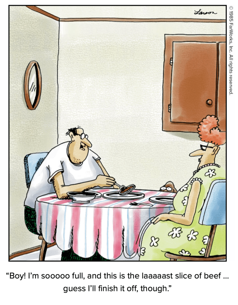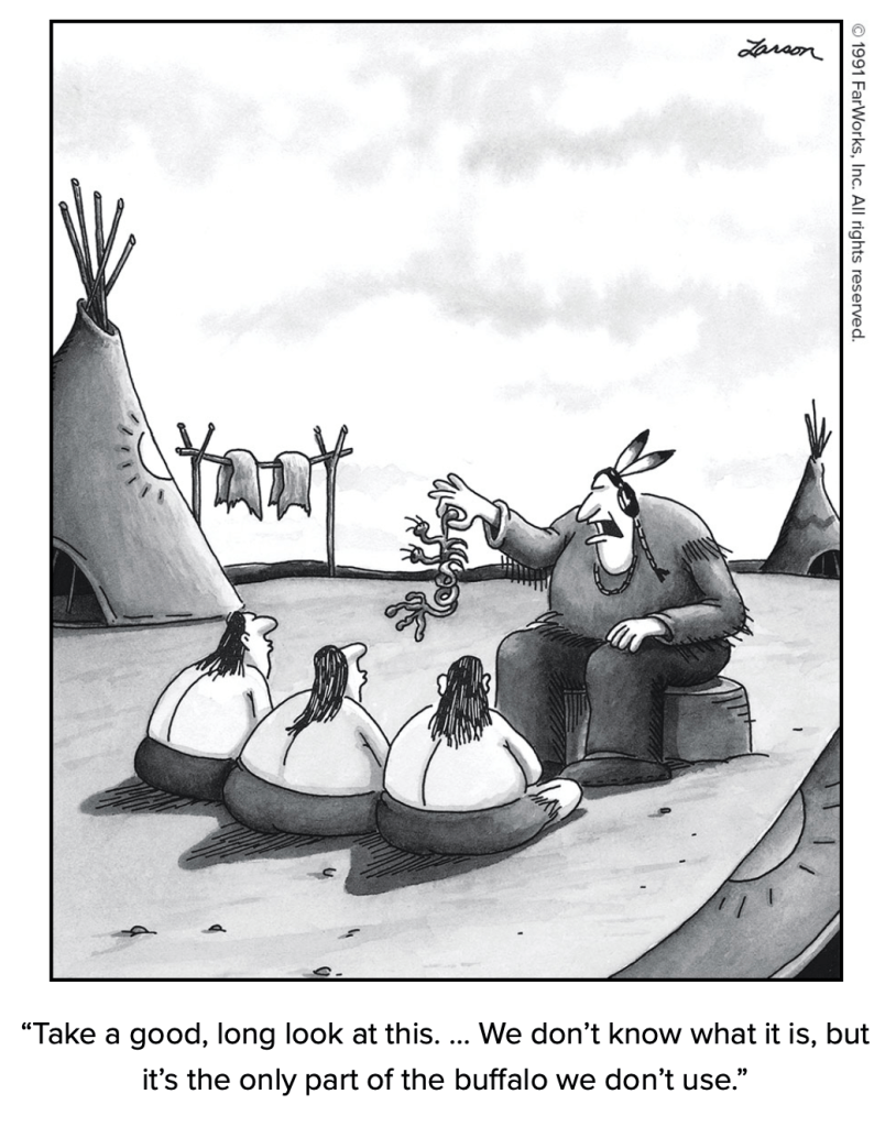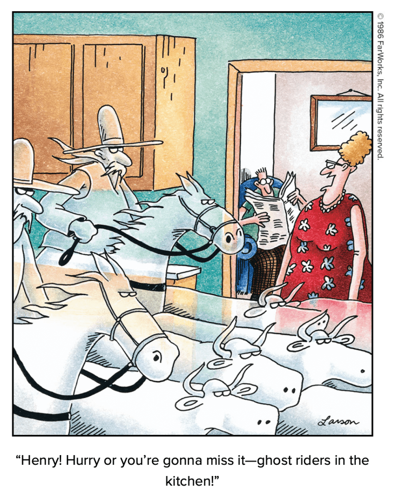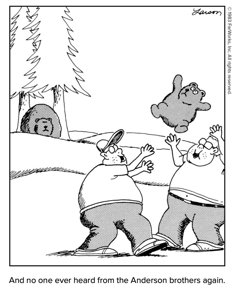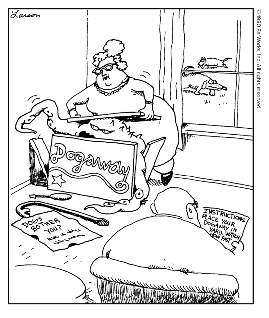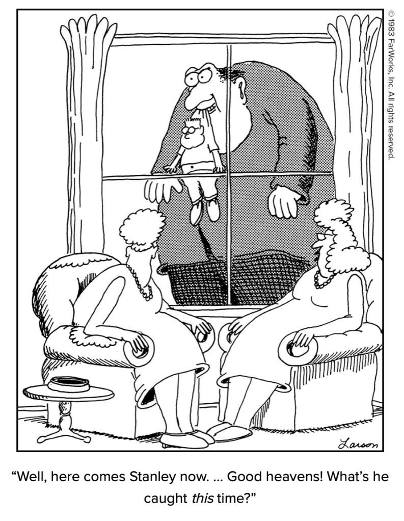 Flip to any page of the massive two-volume collection of The Complete Far Side, and you’re likely to chuckle. Some cartoons are memorable, and others will seem very fresh. An added bonus is some commentary from Larson. Here’s an excerpt of one of our favorites from Volume 2 (p. 80):