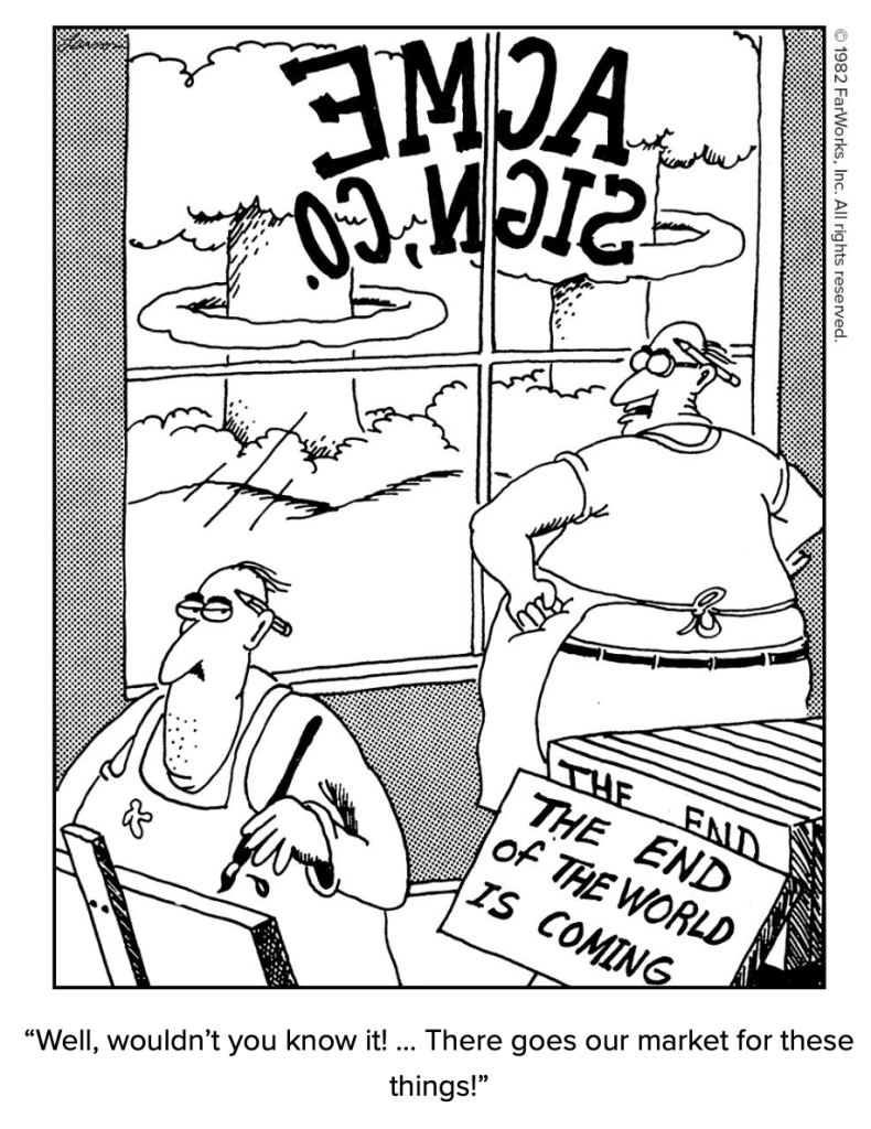 My cmnt: The above cartoon is completely lame. I don’t know if Larson is trying to be Lib and suck up to the envirowackos or what. But it’s just not funny nor clever.