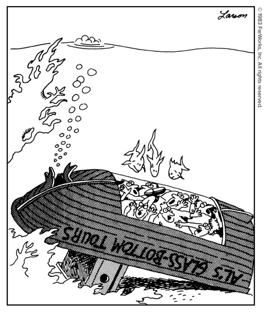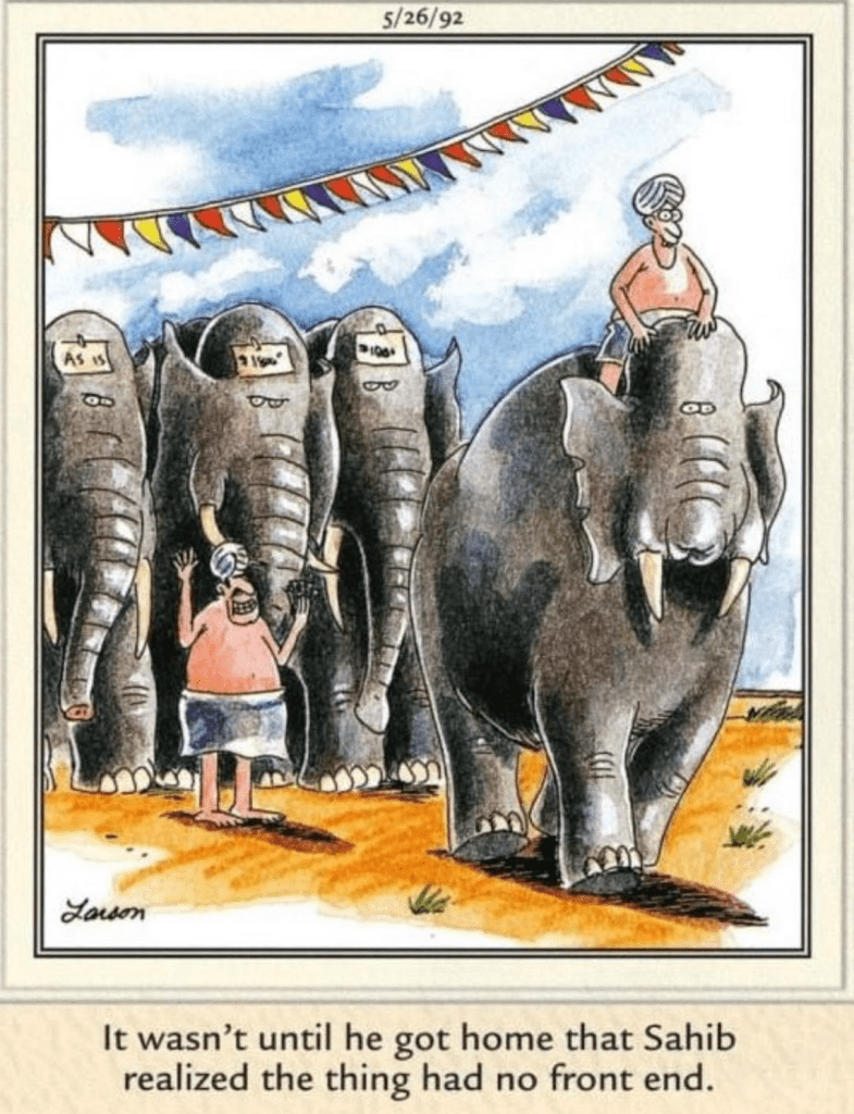 My cmnt: The above is the quintessential Far Side. Elements of the world, completely unrelated and out of place, placed next to each other in a common, quotidian situation. Completely absurd and therefore hilarious.