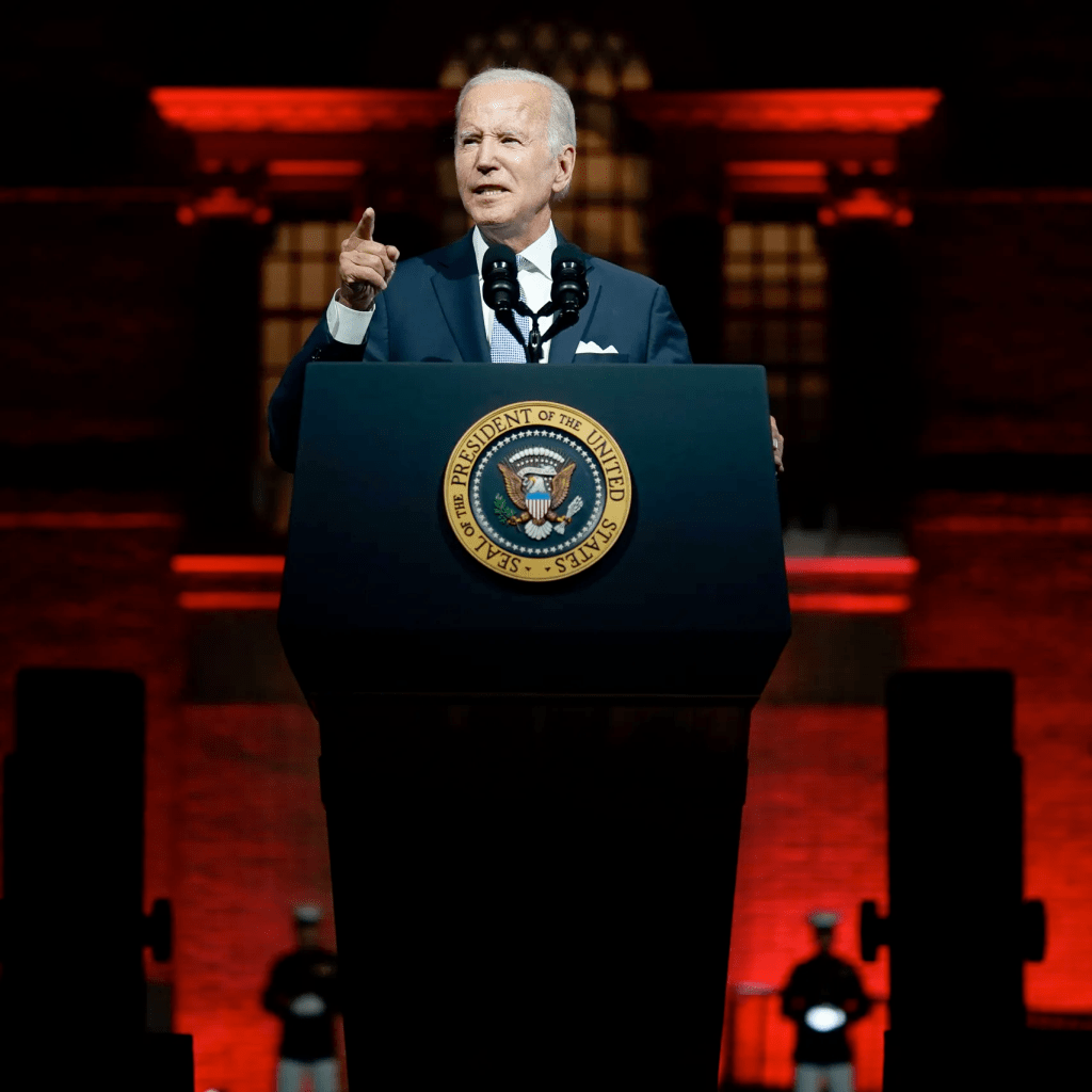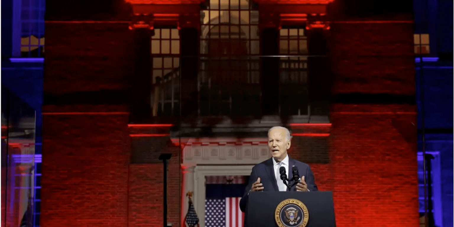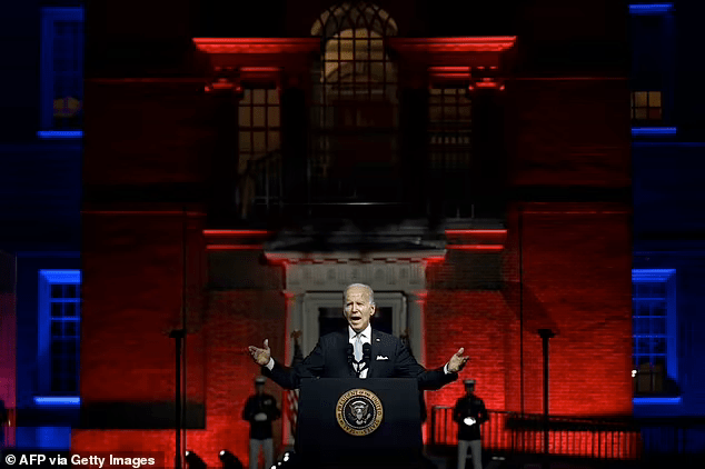 Biden delivered the speech in front of Independence Hall and with red spotlights beaming up the brick facade behind him.