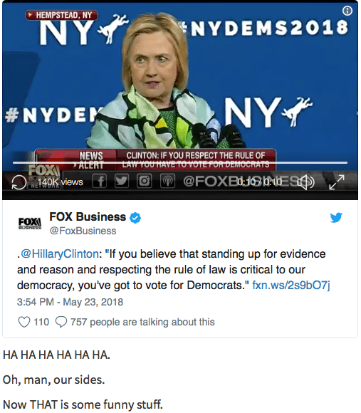 Hillary’s sentiment below is exactly why she lost. She is delusional. Democrats have not in the past, nor now, nor will ever “respect the rule of law”.