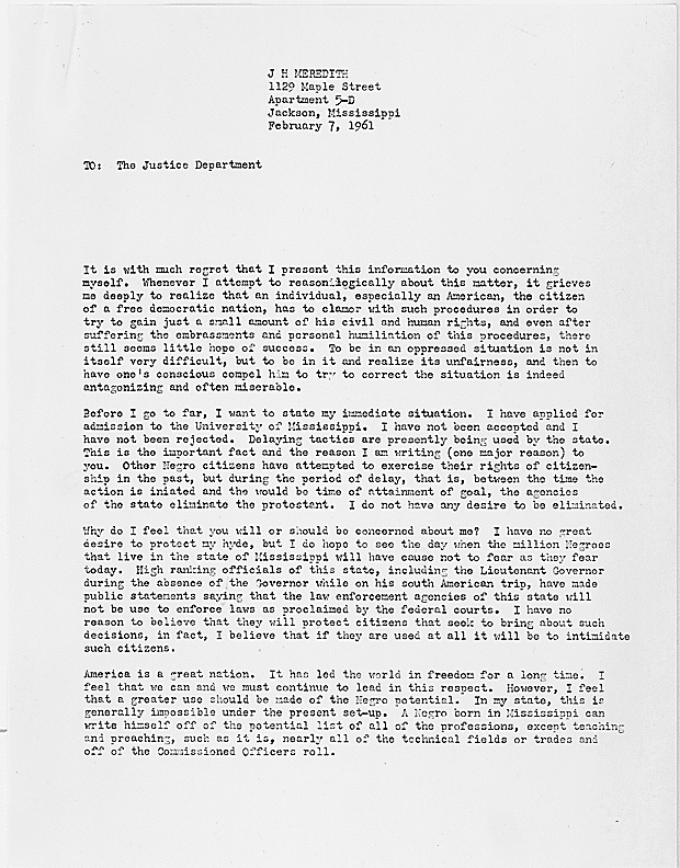 On Feb. 7, 1961, Meredith wrote a beautiful letter to the Department of Justice, describing his inability to enroll at the University of Mississippi, He wrote: