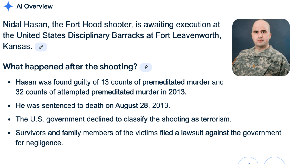 Army Major Nidal Hasan committed mass murder at Fort Hood in 2009, killing 13 people and wounding 30. (To cheer up my liberal readers: Hasan was born in America … to Palestinian immigrant parents.)