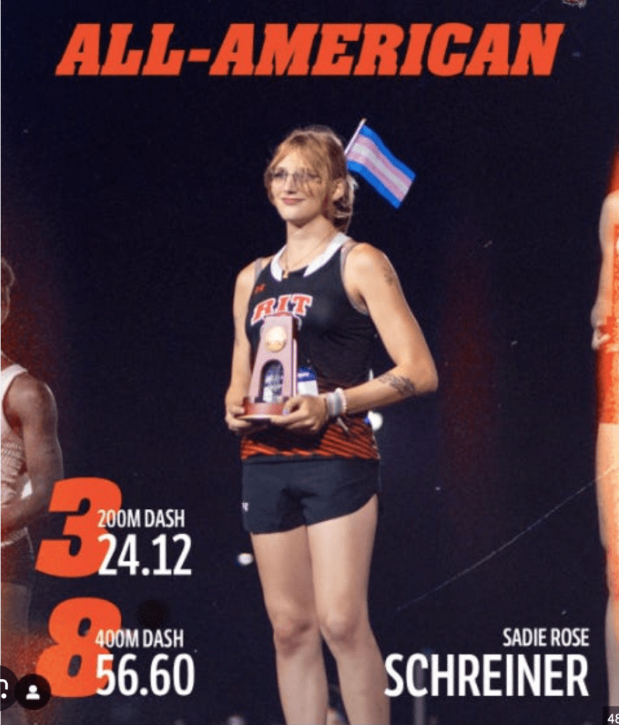 Sadie Schreiner, who formerly went by Camden Schreiner, is permitted to compete with and against female track and field athletes at Rochester Institute of Technology (RIT), despite being a male. Schreiner identifies as transgender.