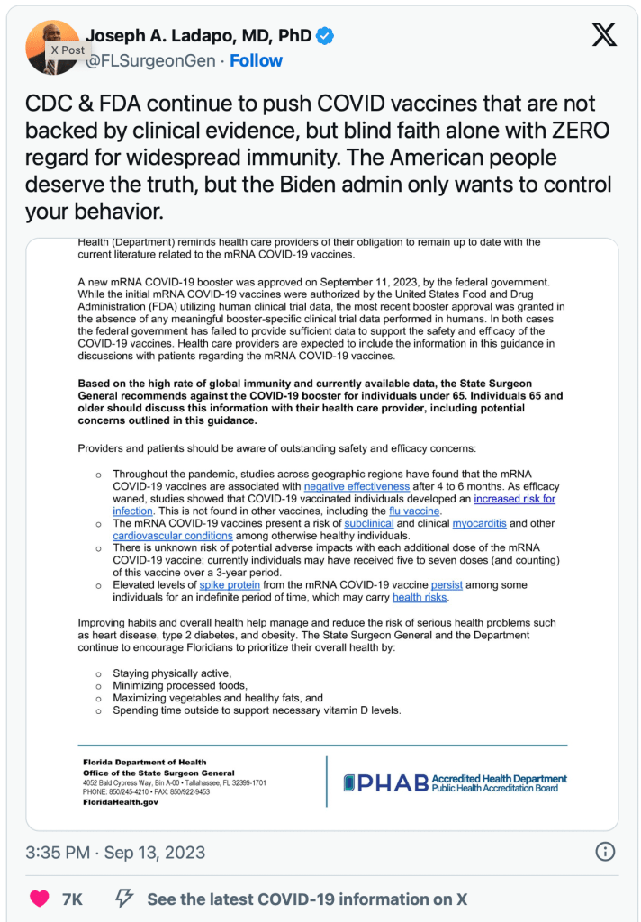 “CDC & FDA continue to push COVID vaccines that are not backed by clinical evidence, but blind faith alone with ZERO regard for widespread immunity,” Ladapo said in a 2023 update, advising against coronavirus booster shots for most people.