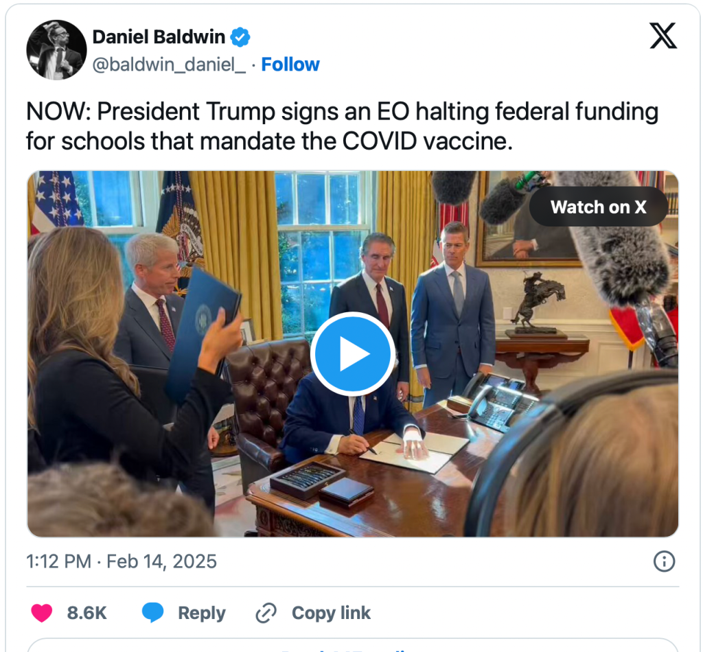 President Donald Trump has since taken executive action to halt federal funding for schools mandating the coronavirus vaccine.