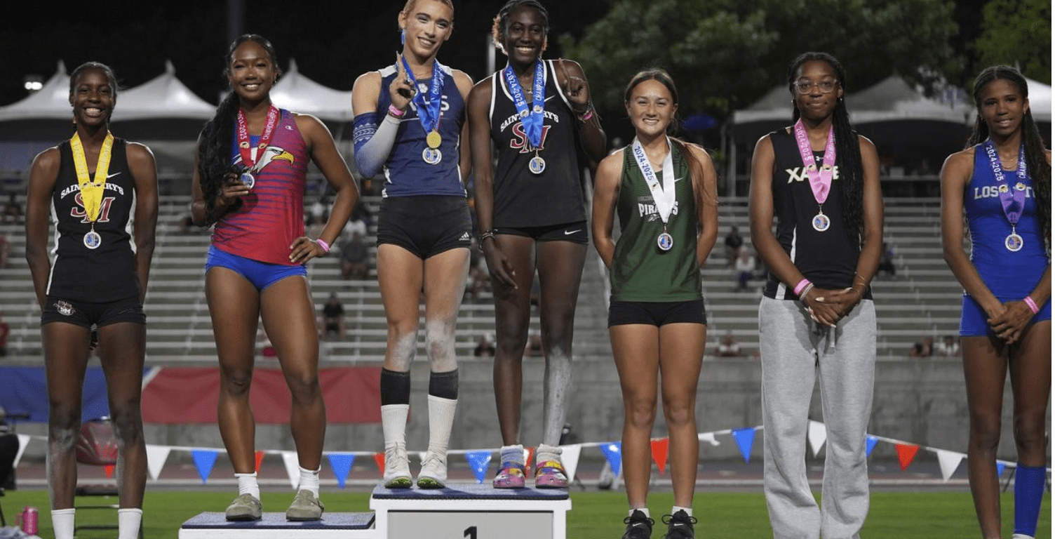 A trans athlete has sparked a furore after flaunting their gold medals on the podium after winning at the state track championships.