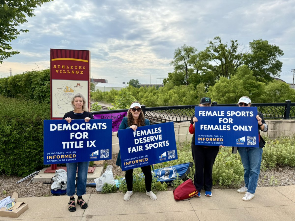 Outside the stadium Friday morning, a small group of protesters gathered peacefully, holding signs that read “Females deserve fair sports” and “Democrats for Title IX,” signaling bipartisan opposition to the policies that allowed Rothenberger — a biological male — to compete in the girls’ division.
