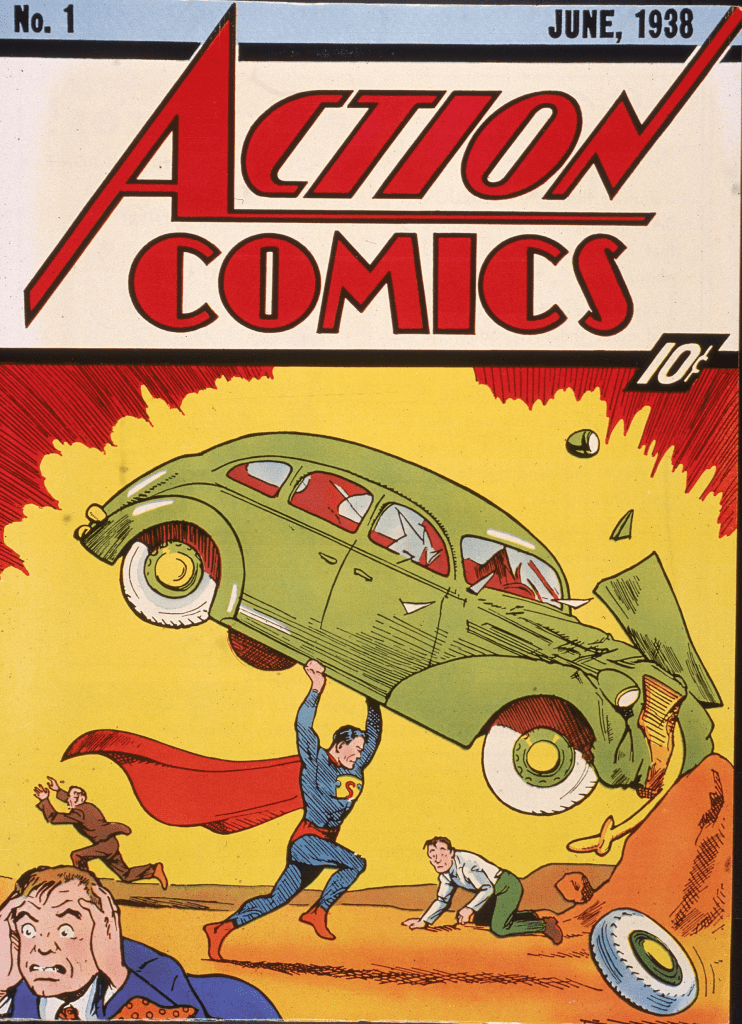 Cover illustration of the comic book Action Comics No. 1 featuring the first appearance of the character Superman in June 1938. (Photo by Hulton Archive/Getty Images)