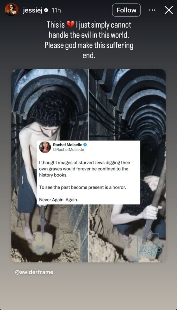 One thought on “Pop Star Jessie J Blasts ‘Evil’ Hamas over Israeli Hostage Evyatar David Starved in Gaza Tunnel: ‘Please God Make This Suffering End’”