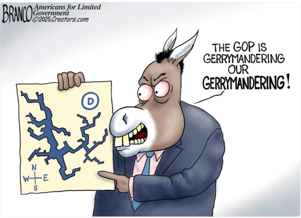 My cmnt: Three of the nine heavily gerrymandered democrat-run states listed below send ZERO Republicans to the House despite having large pockets of each state predominated by Republicans. Their governors threaten retaliatory redistricting (gerrymandering) against Texas. What? What are they going to do send even LESS Republicans to the House? I know democrats are terrible at math but I have news for them, they can’t send less than the zero people they do now!