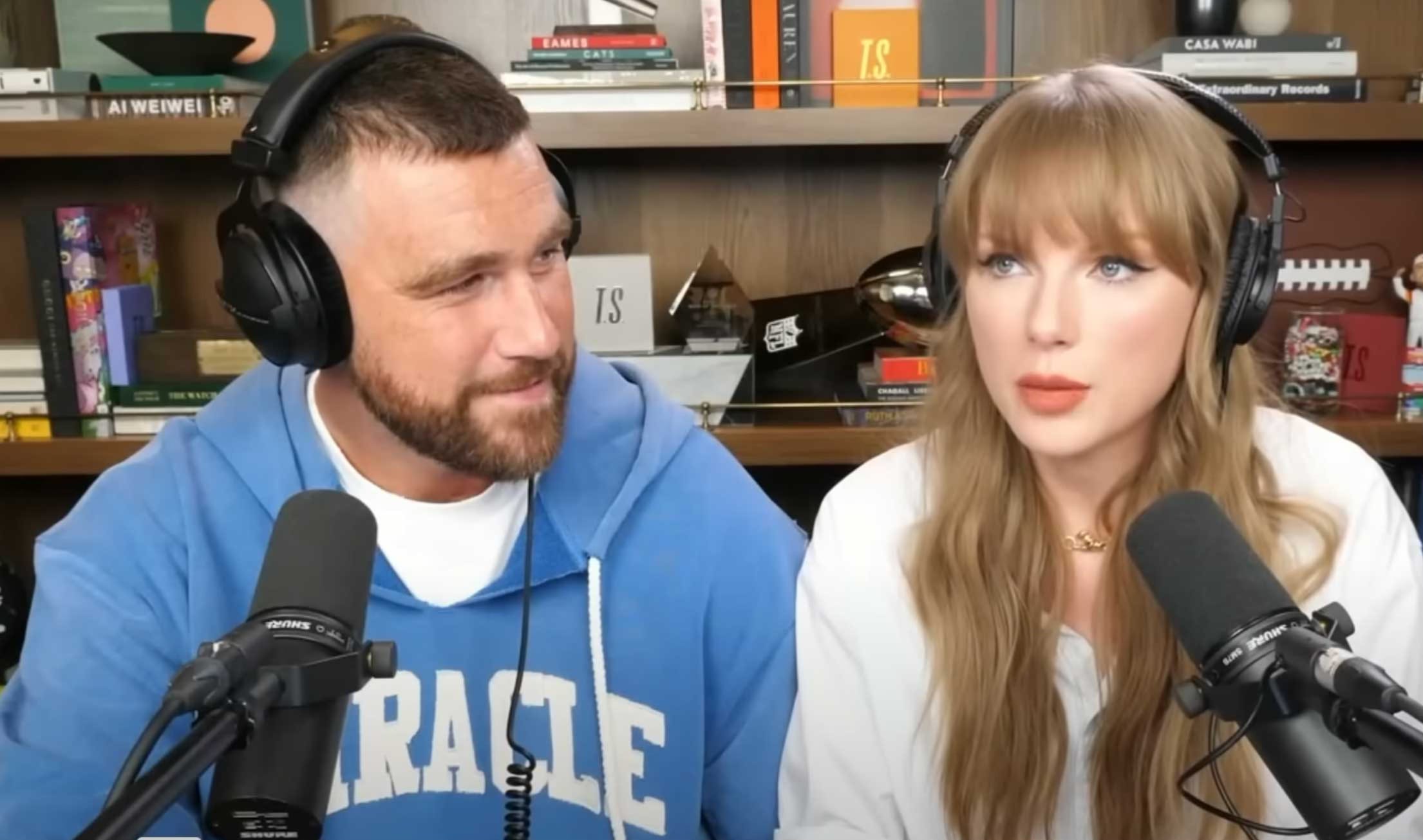 “The Taylor interview—which now has over 12 million views on YouTube—felt more like a double date with a lovely couple you’re just getting to know,” writes Will Rahn. (Screen grab via New Heights podcast)
